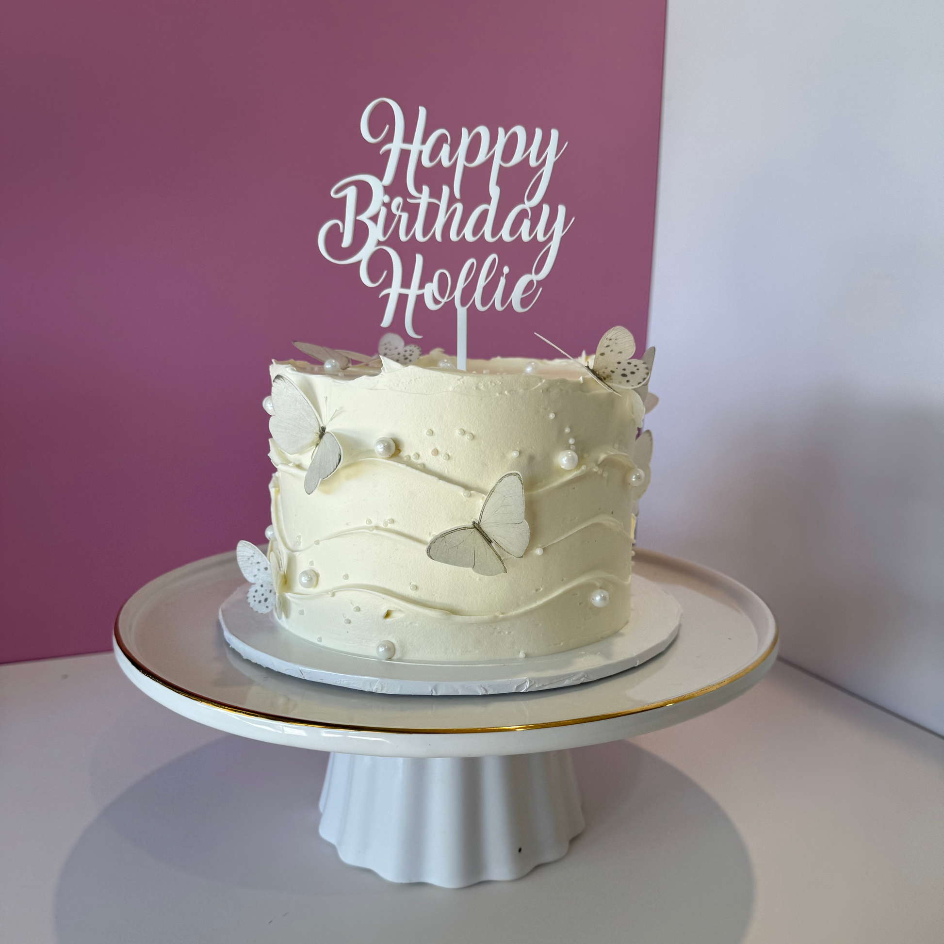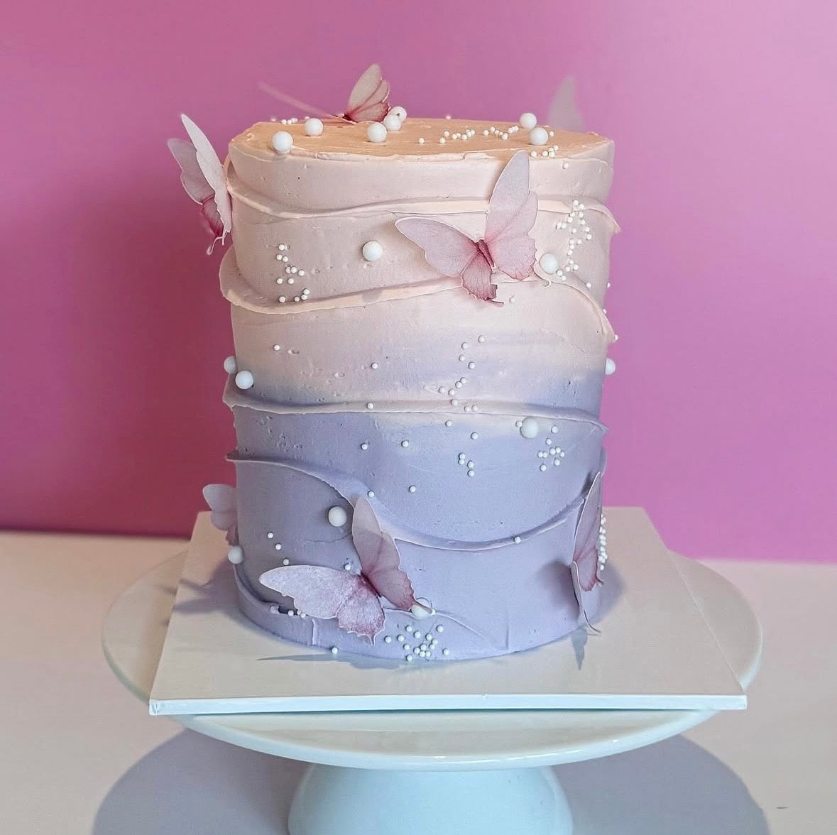 Soft ombré buttercream waves, edible pearls and edible wafer paper butterflies. Whimsical & beautiful, the perfect centrepiece for birthdays, baby showers, and dreamy celebrations.